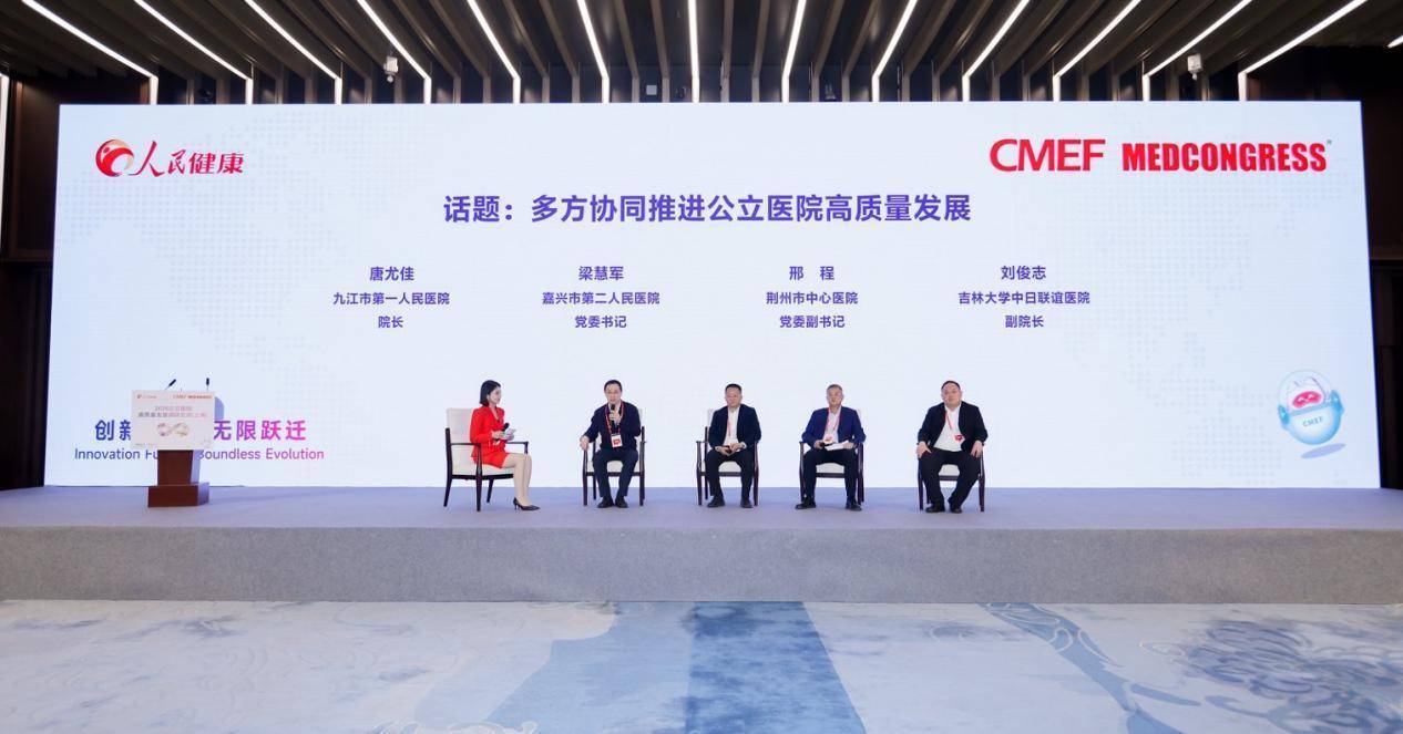 4月11日,在第93届中国国际医疗器械博览会(CMEF)现场,人民健康组织开展了2026公立医院高质量发展调研交流(上海)。在圆桌对话环节,江西省九江市第一人民医院院长唐尤佳、浙江省嘉兴市第二人民医院党委书记梁慧军、湖北省荆州市中心医院党委副书记邢程、吉林大学中日联谊医院副院长刘俊志,围绕AI技术临床落地、智慧医院建设及“十五五”期间医院发展规划两大核心议题,结合一线管理实践分享实操经验与发展思路。