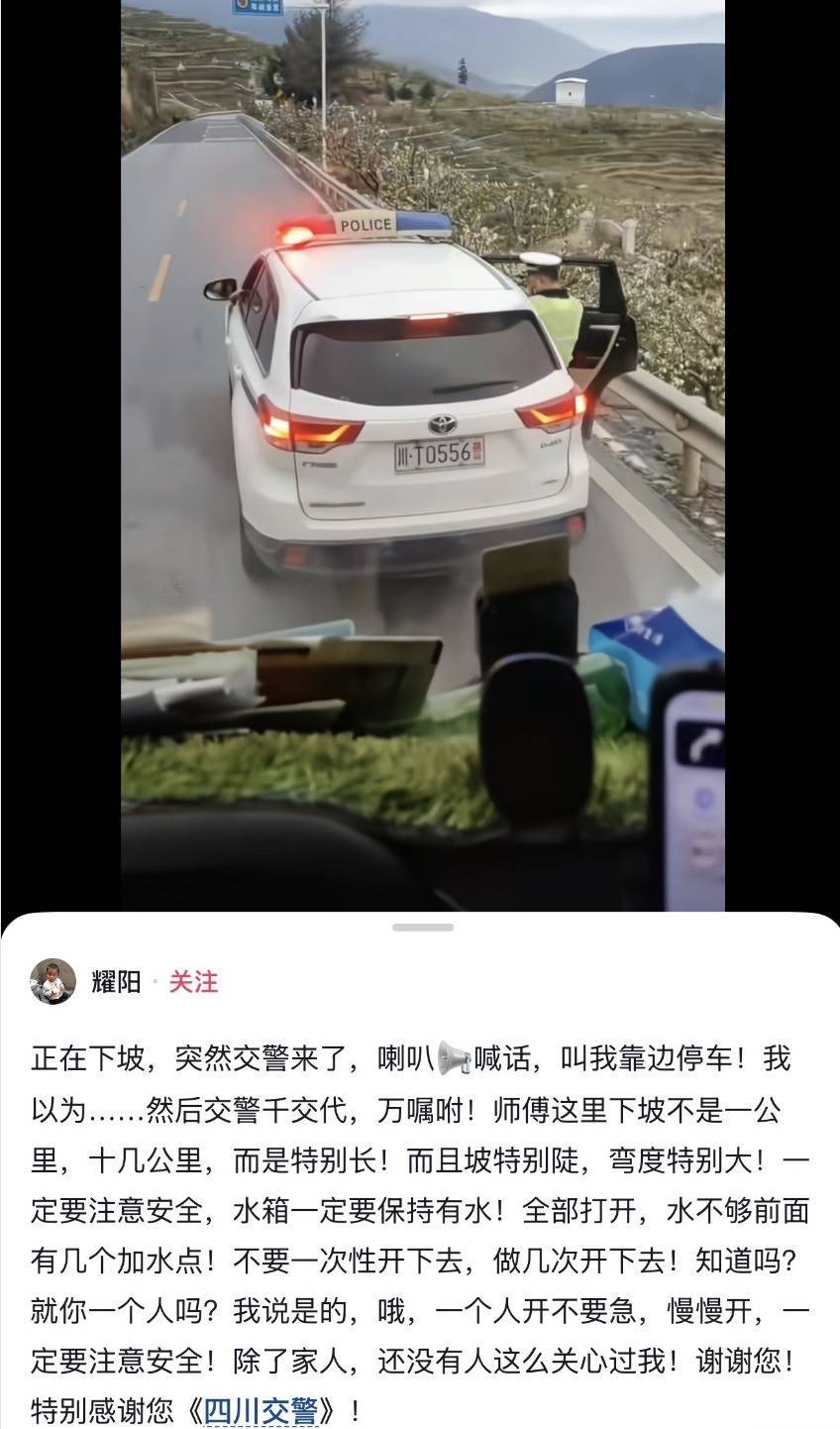 司机记录交警“碎碎念”的短视频截图。新华社发李东明值守的国道108线泥巴山段,海拔3300余米,拥有23公里超长连续下坡路段,山路蜿蜒曲折、路况复杂。过往货车长时间制动,极易出现刹车片过热、车辆制动失灵等问题,曾事故多发,被称作“魔鬼路段”。