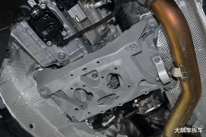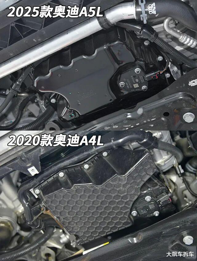 这台A5L上的5代EA888发动机油底壳是钢制油底壳,而老款A4L上的3代EA888发动机是工程塑料油底壳,由于工程塑料膨胀系数和缸体不一样,因此可能会渗油,这台A5L明显进行了改进。