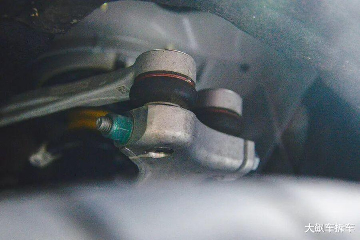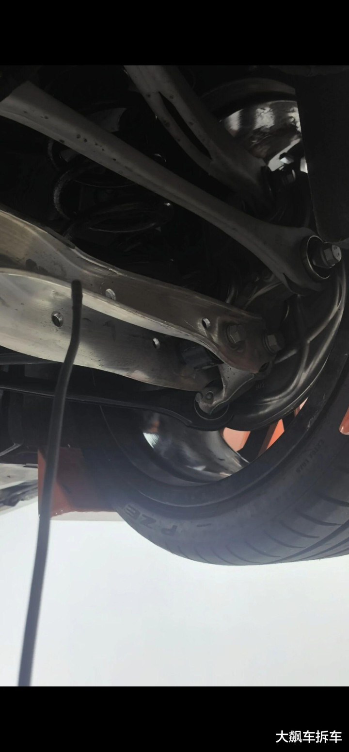 不要以为银色的摆臂都是铝合金的,上面两根摆臂是钢板冲压的,只不过涂了一层银色的美加力涂层,和下面真正的铝合金摆臂颜色并不相同。