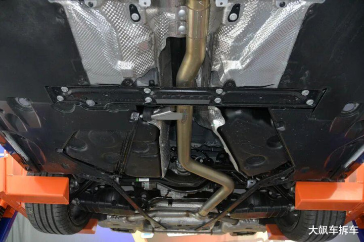 底盘两侧护板非常完整,排气隔热也很到位,预留了大排量发动机双排气管的位置。