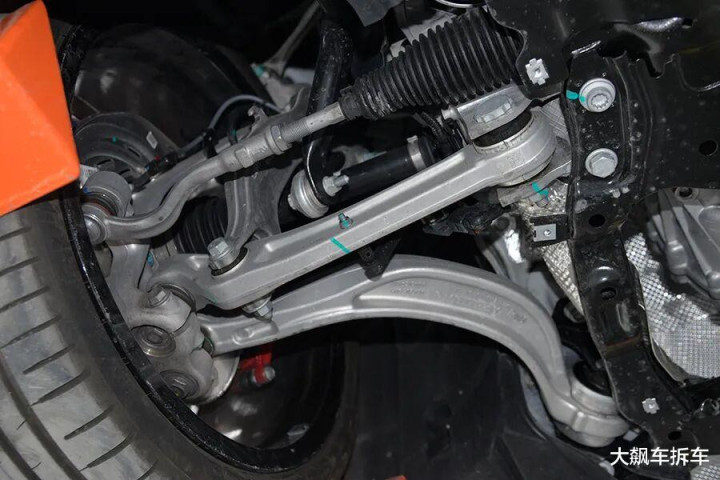 与绝大多数正经奥迪车一样(排除大众换壳车),前悬是铝合金双插臂结构,并且上下都是双球结构。这种结构最大的好处是提升操控的精准性,但悬架调校难度也相应增加,所以一般很少有厂家用。