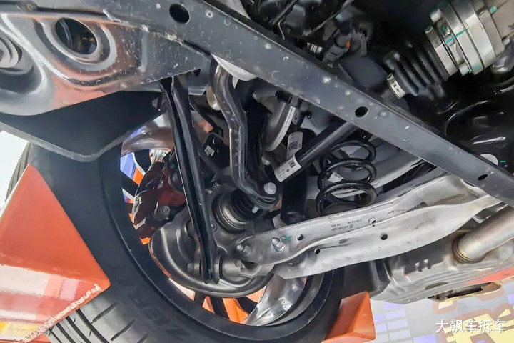 这辆新款奥迪A5L的底盘基本和老款A4L相同,无论是结构,还是用料都保持一致,依旧是豪华车的水准。大量应用铝合金。前悬双球双叉臂、后悬五连杆,这是豪华车应有的结构和用料。前副车架的X结构更加粗壮,车身中部增加了一根铝合金加强梁,底盘刚性得到增强。不过,海外版车型后轮是通风刹车盘,而国产的依旧是实心盘,成本得到了有效“控制”,不知道什么时候才能真正做到海内外同权?