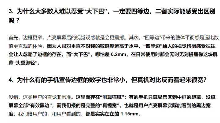 李杰解释,部分友商在宣传时存在“测算猫腻”,公布参数只计算显示区域到中框距离,不计算全部“有效黑边”。由于测算边框宽度没有行业统一标准,厂商根据自己最有利的策略宣传,这也造成了某些厂商宣传业绩最窄边框,实际上还不如一加15采用1.15mm计算方式,甚至视觉观感比小米17系列1.18mm还宽,透支消费者信任。