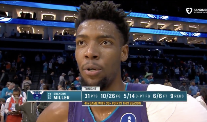 赛后,黄蜂球员布兰登-米勒接受媒体采访,谈到了球队多名核心球员不打但依然赢球的话题。